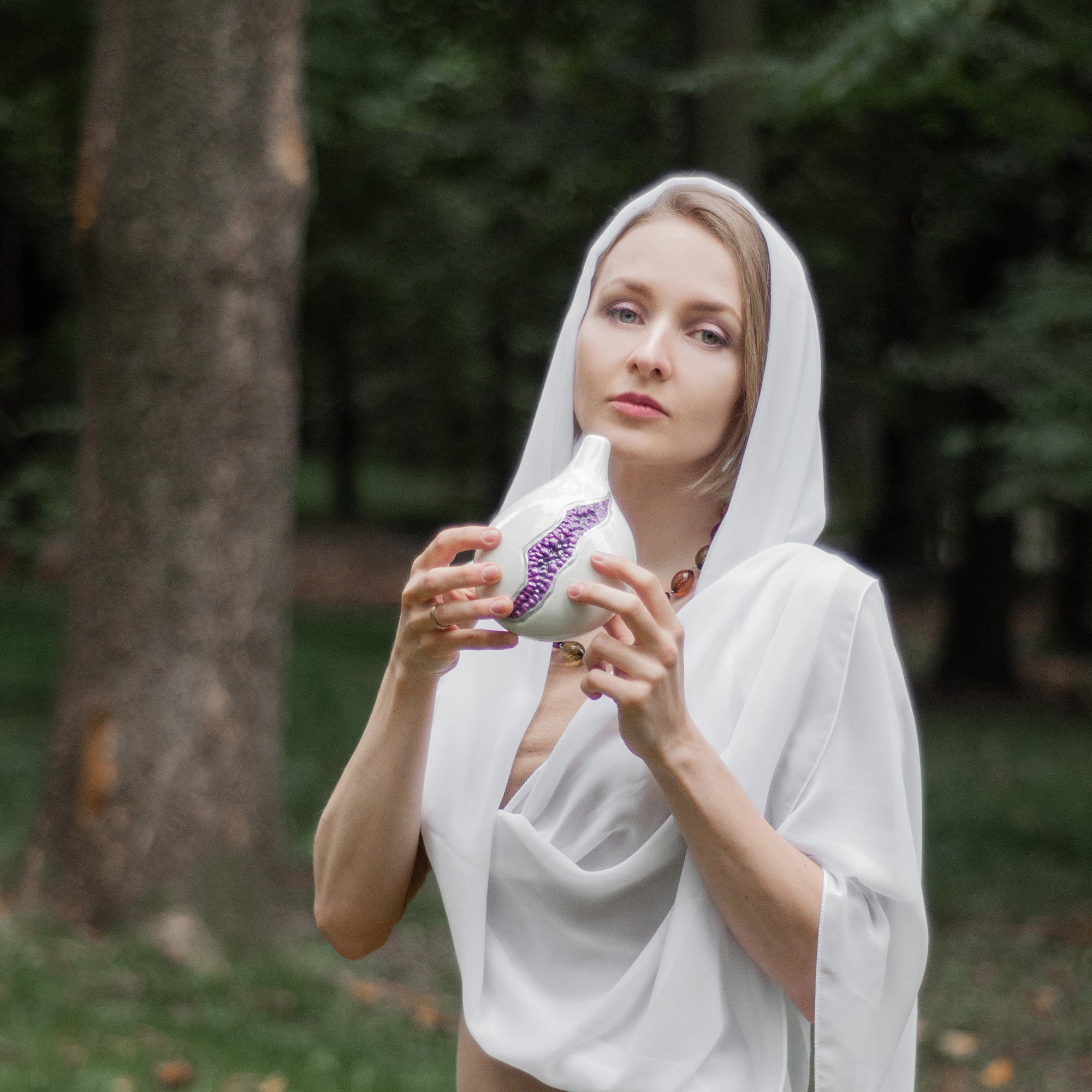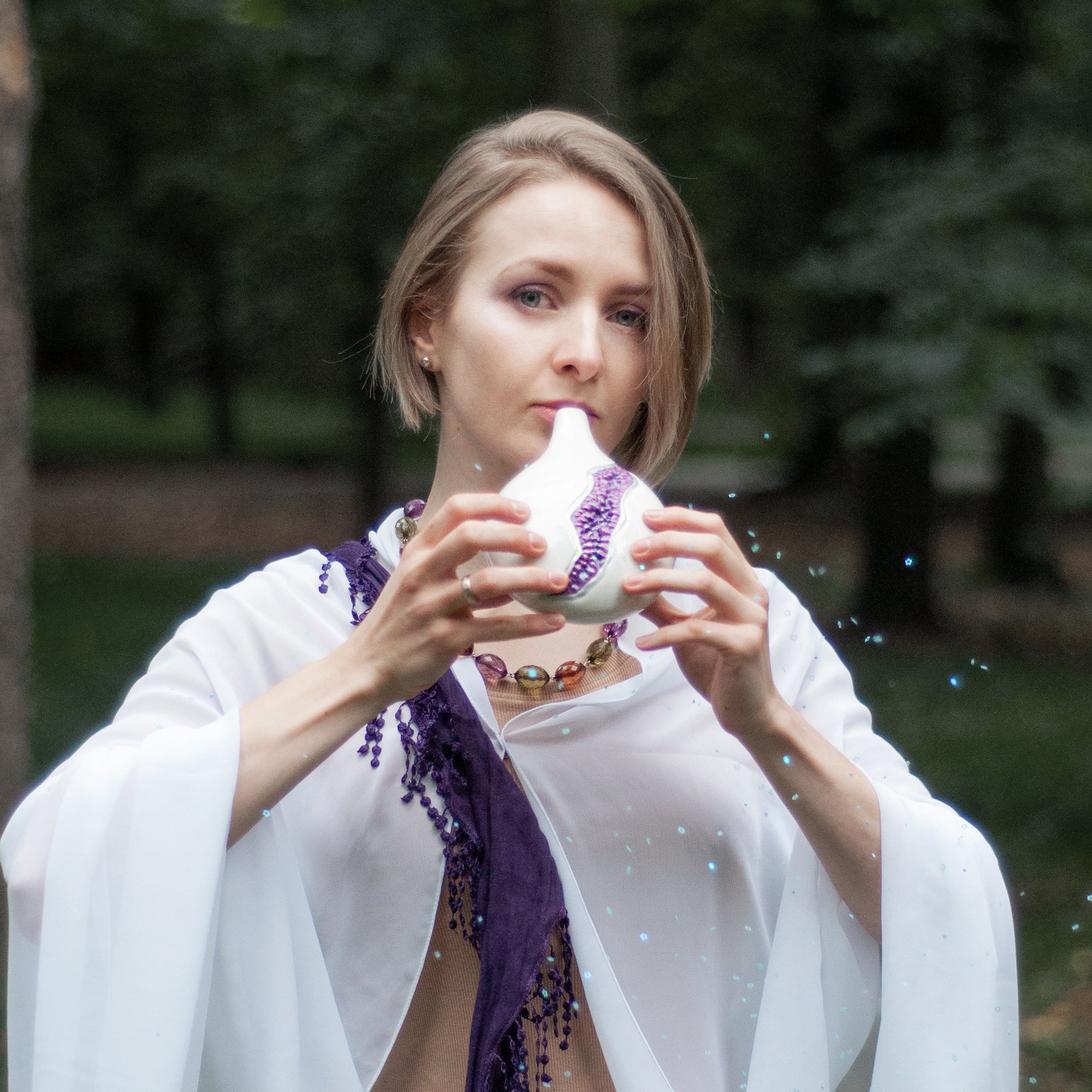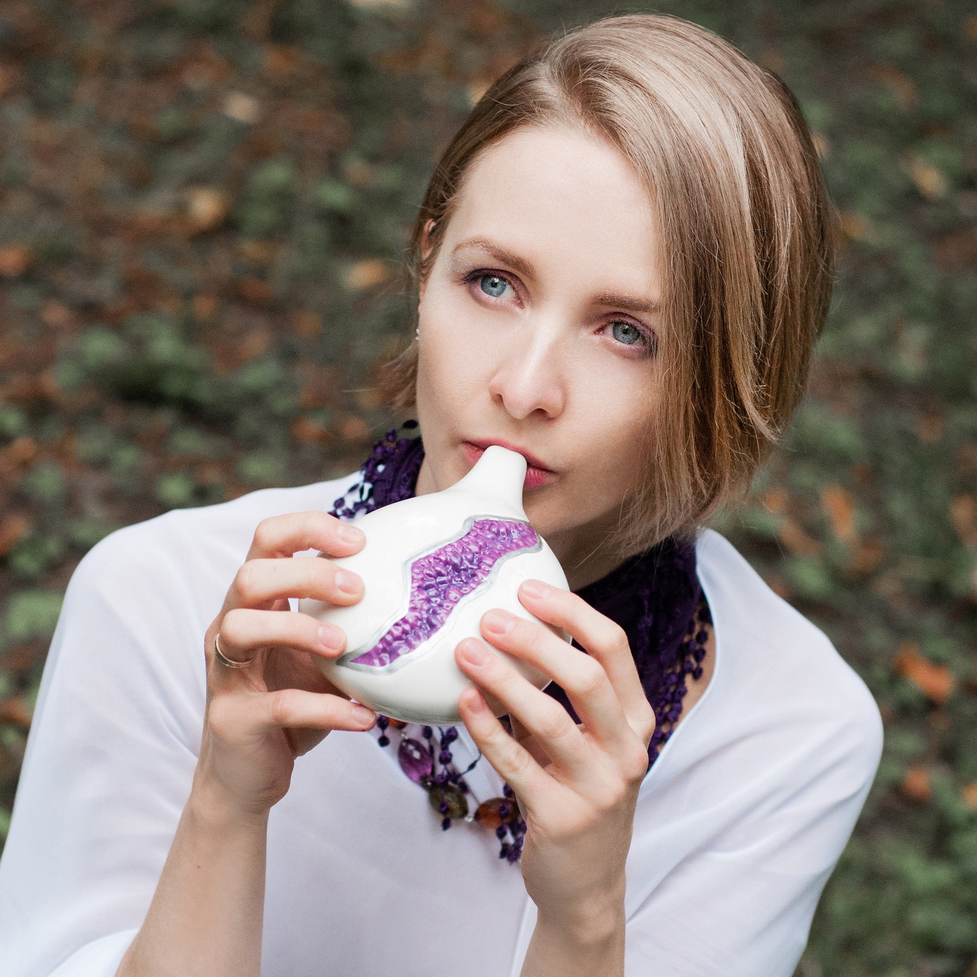 For musicians who have always longed for a deeper sound but worry bass ocarinas are simply too large for comfort, the Geode ocarina is a gorgeous solution. The minimalist aesthetic highlights smaller fingering holes specifically crafted to be easily covered no matter your hand size while the 6-hole pendant style ensures you can have a deep sound without the hefty weight of a 12-hole bass ocarina. The ocarina itself is a smooth, warm white teardrop shape with a Geode-inspired focal point lined in silver and sculpted to resemble crystals hidden within.