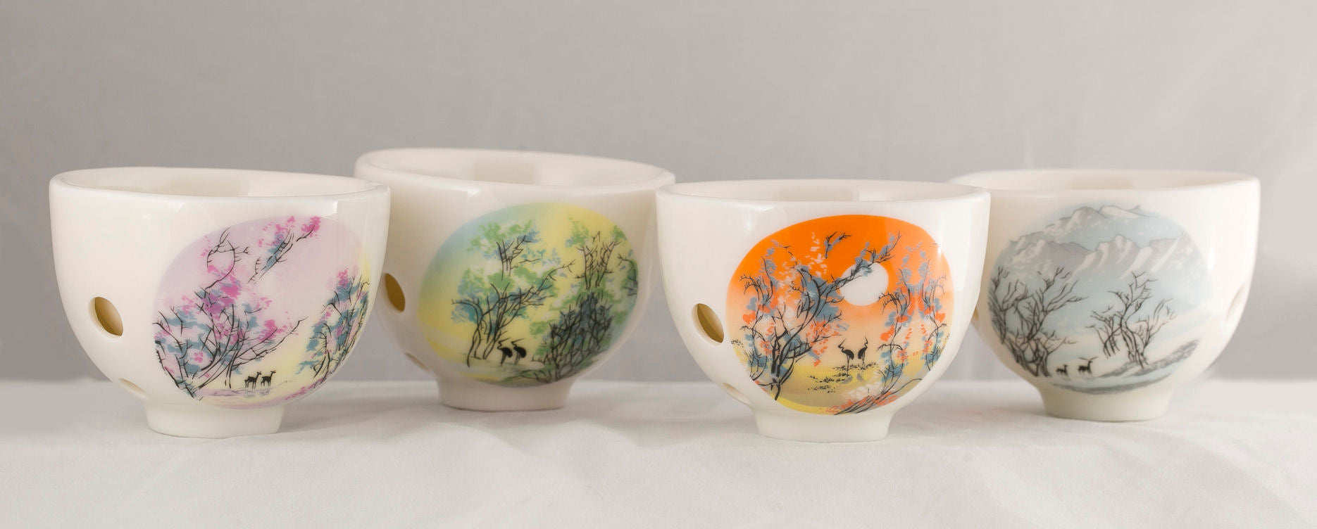 Currently, there are Four Colored Varieties available (Blue/Yellow, Blue Ombre, Brown, and Metallic), and Four White Seasonal Teacarinas (Spring, Summer, Autumn, Winter). If we do not receive a note from you, we'll send you the set with 4 different colored variety Teacarinas as pictured above, when all items are in stock.