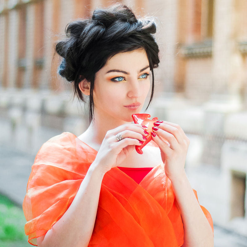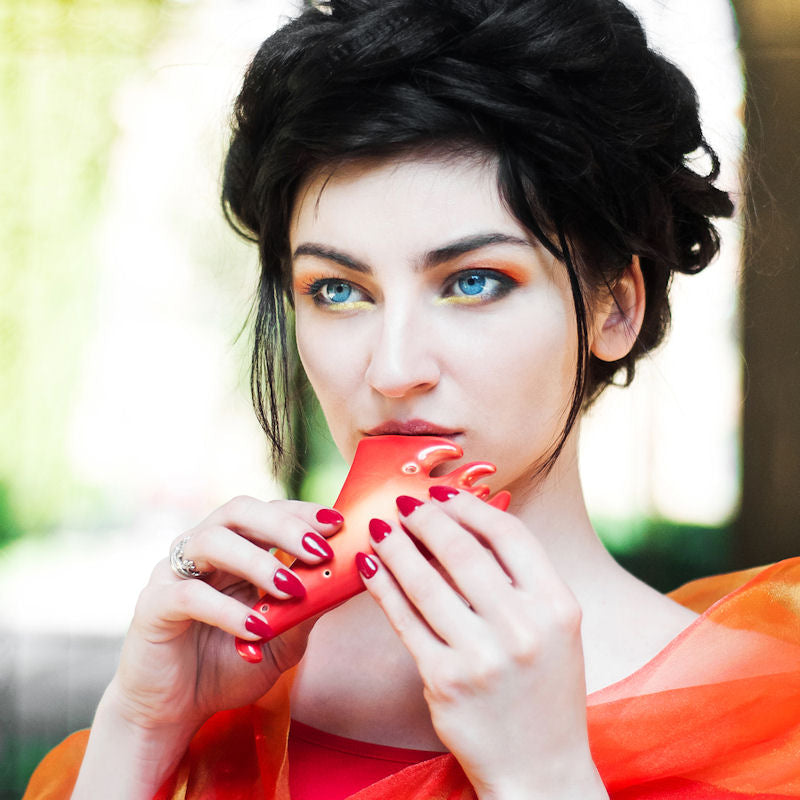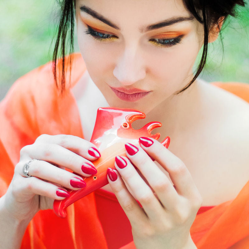 The Fire Alto Ocarina is accurately tuned in G Major with a pitch range from E5 to C7. It is handcrafted from high grade ceramic designed with the vibrant color and shape of a flame burning brightly. It offers a sound that is just as beautiful as it looks. It measures 4 inches in length and comes with an online instructional booklet.