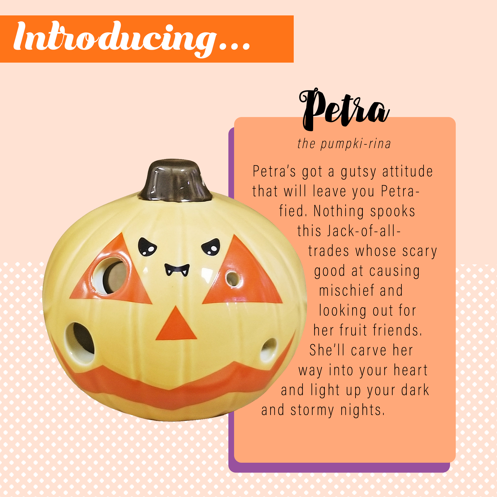 Petra’s got a gutsy attitude that will leave you Petra-fied. Nothing spooks this Jack-of-all-trades whose scary good at causing mischief and looking out for her fruit friends. She’ll carve her way into your heart and light up your dark and stormy nights.