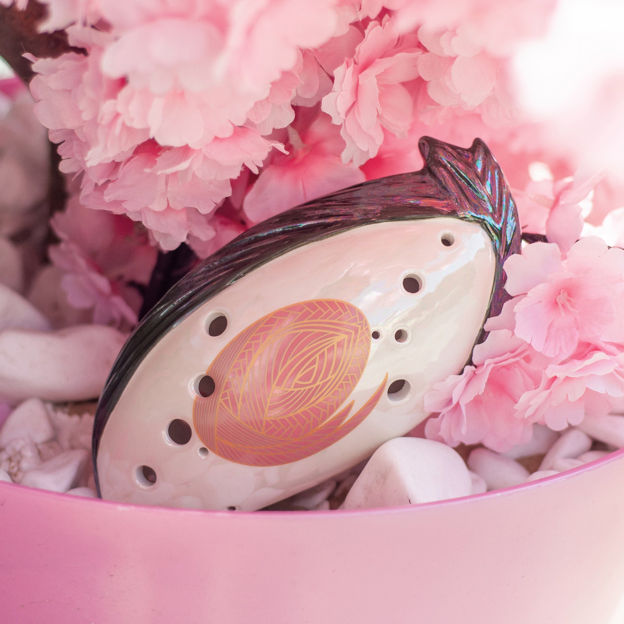 The Spring ocarina also features a mesmerizing iridescent, mother-of-pearl finish. This unique surface transforms the ocarina into a work of art, inviting you to explore the realms of melody and color in perfect harmony.