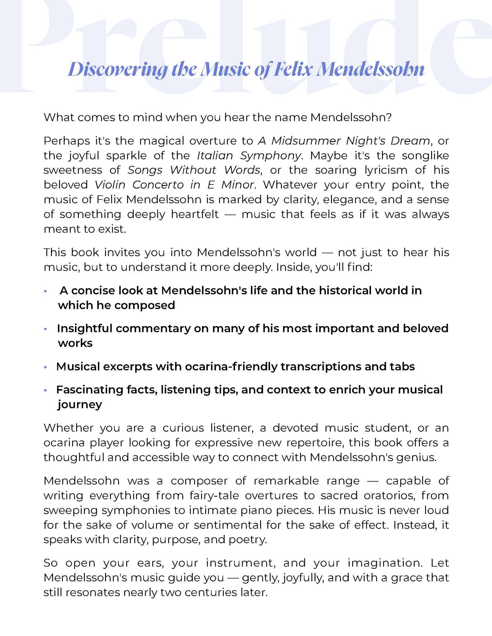 This book invites you into the world of Mendelssohn through a carefully curated selection of his most beloved works—each adapted with the ocarina in mind. You’ll find expressive melodies, enchanting moods, and memorable themes that are as enjoyable to play as they are to hear.Inside you'll discover: