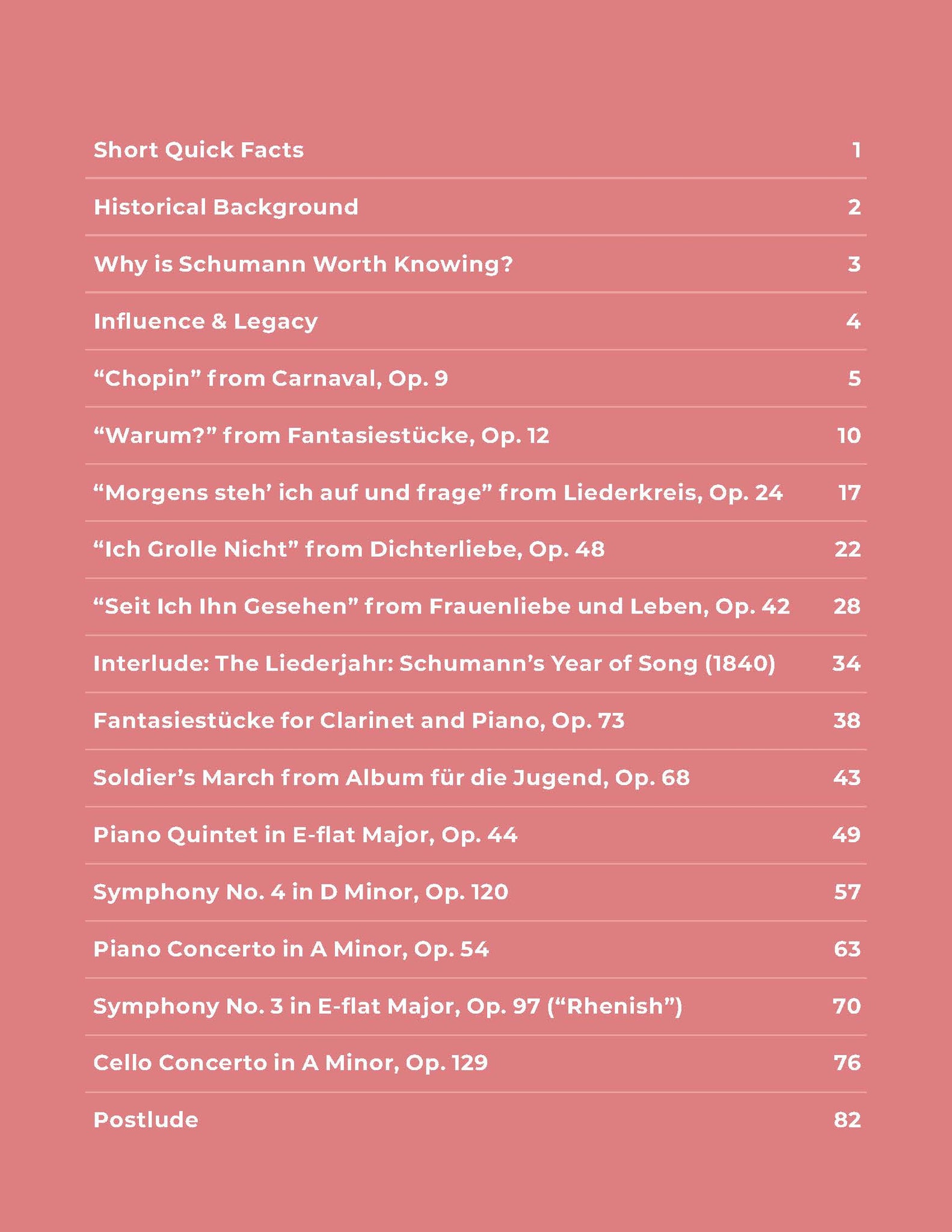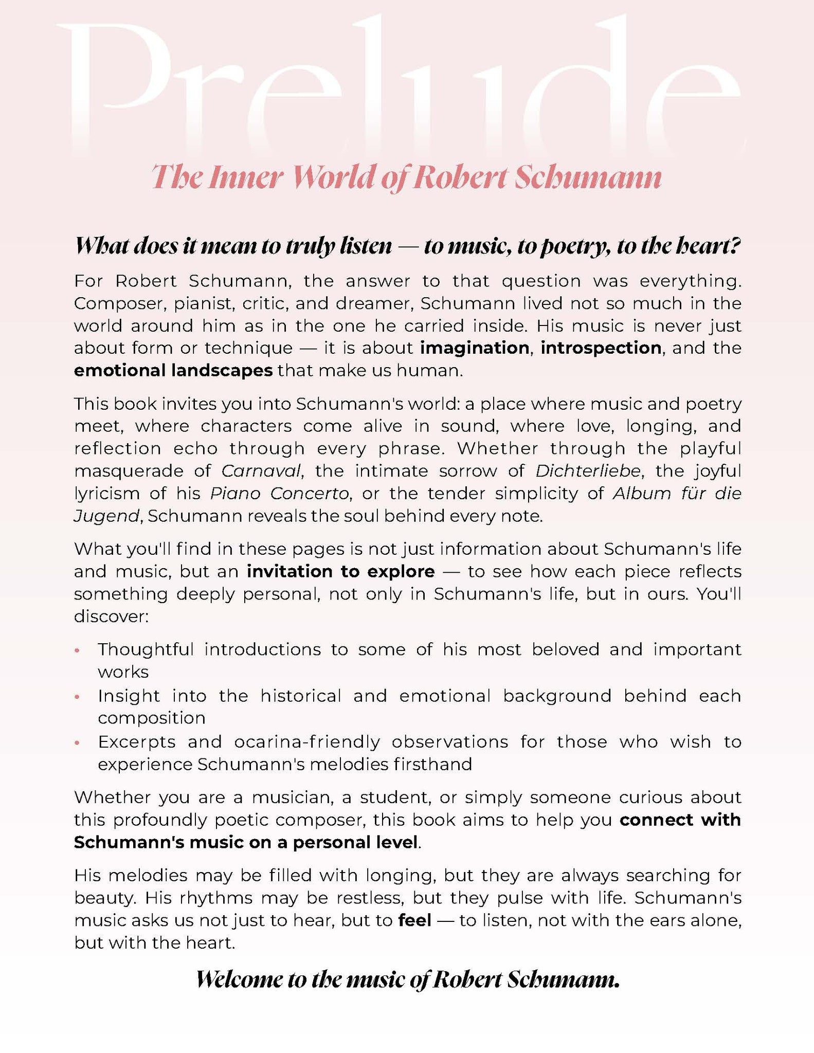 From the lyrical charm of Kinderszenen and the mystery of Carnaval, to the soaring beauty of his symphonies and the intimacy of Dichterliebe, this book offers a curated journey through Schumann’s most iconic and beloved works.